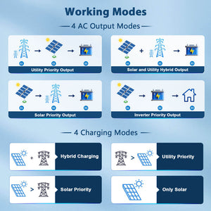 - ★ Four charging / Output modes: Charging modes include - Hybrid Charging / Utility Priority Charging / Solar Priority Charging / Solar-only Charging. AC Output modes include: Utility Priority / Solar + Utility Hybrid / Solar Priority / Inverter Priority. Schedule and adjust your system as your needs change.